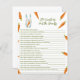 男女兼用ベビーシャワー招待状。ことわざ「小さなバニーが道に!」をフィーチャーした水色のバニー(ウサギ)とニンジンのイラストレーション、そしてオレンジ色のニンジンの多くの。一致する項目が使用可能。