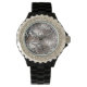 チーター、ヒョウ、トラのプリントのブレンドのイメージと女性のライン石ブラックエナメル時計。ラウンドのチャーム、ラウンドの基本ボタンキーチェーンとラウンドネックレスを参照。ACCESSORIESセクションのThis & That Watchコレクション全体を参照。