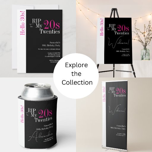 - Simple RIP 20s, Hello 30s design, is in classic black and white with a pop of hot pink.