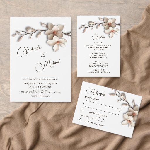 Textured ivory magnolia branch enclosure card. With a headline in an elegant handwritten script.