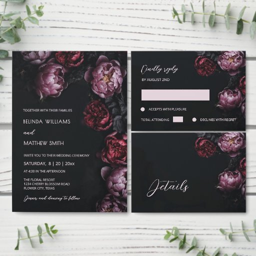 Textured peony flowers dark moody details enclosure card. With a headline in an elegant handwritten script.