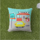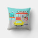 この50年代のダイナーの屋外の枕と特別な何かに役立って下さい。 漫画のスケッチの設計特微は屋根で青い窓、灰色の両開きドアおよび言う白い印が付いている赤レンガの建物、"ダイナー"とまりました。 駐車場では、第2印は棒にあります。 印にあります方法をを指すターコイズの背景および点滅の赤い矢が"ドンダイナー"。の 印はそれの隣で駐車されるひれが付いている明るく黄色い車があるので仕事をしました。 私達がそれらを見ることができないのに車の乗客は唇を平手で打ったにちがいありません。 かわいく、若いcarhopは車へローラースケートで滑る彼女の方法です。 彼女のブルネットの毛は弾力があるポニーテールにあります。 彼女は黒いトリムが付いている短い、ピンクのユニフォームおよび白いエプロンを身に着けています。 釣り合った一方では、carhopは巨大なハンバーガーおよび新たになることをのソーダの旧式、ガラスビン保持する黒い皿を運んでいます。 ダイナーの後ろの背景はヒマラヤスギ木の淡いブルーの雲そしてシルエットを持つティール(緑がかった色)です。 枕の反対側はおもしろい、赤レンガパターンを特色にします。