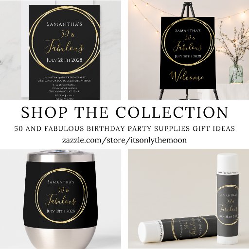 シックで50歳のエレガント誕生日パーティーデザイン。このスタイリッシュデザインはクラシックブラックと金ゴールド。文字「Samantha is 50 and Fabulous」とお祝い日がある。このシンプルタイポグラフィモダンモチーフは金ゴールド箔の輪でエレガント囲まれている。文字「50 and Fabulous」も金ゴールド箔に含まれている。このスタイリッシュデザインは、シックで忘れられない50th誕生日パーティーお祝いに最適だ。パーソナライズするには、この文字・ボックスに名前と日付を追加する。色またはフォントを変更するには、デザイン編集ツールをチェックアウトする。パーソナもしリ救済ゼーションが必要か、zazzleチャットや電子メールでカスタムデザインを作成する場合はursuladawnmoon@gmail.comを参照。