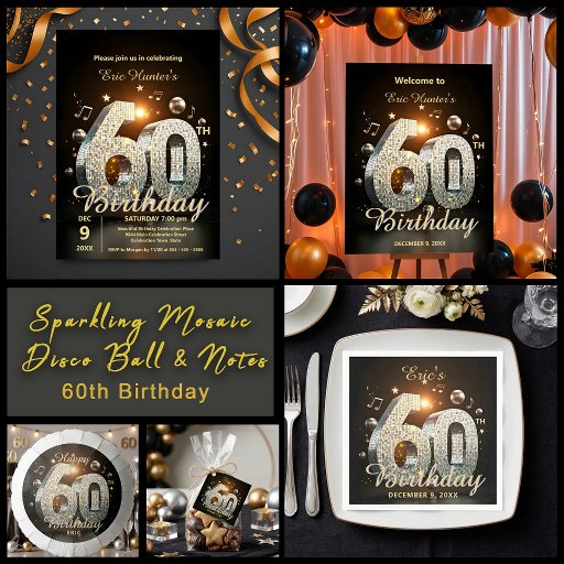 Sparkling Mosaic Disco Ball & Notes 60th Birthdayデザイン: Kristina Lj Petrovska