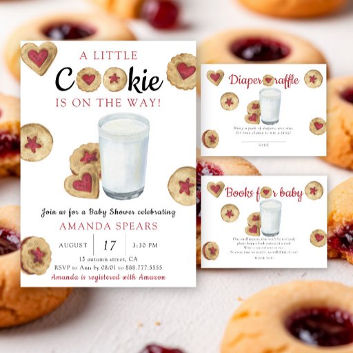 A Little Cookie Is On The Way! Milk and Cookie Baby Shower. Watercolor baby shower party. Watercolor cookies with jam and glass of milk.