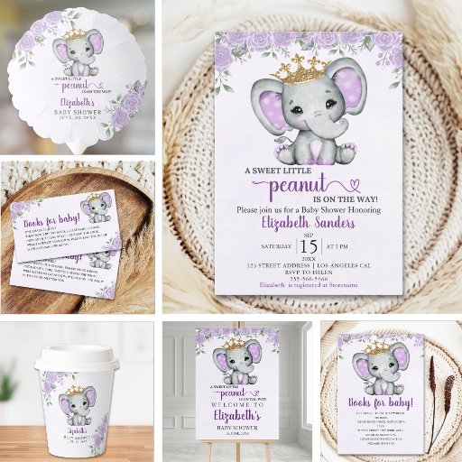 A lovely design for your baby shower for a girl features a beautiful purple watercolor elephant, all set against a pretty purple and black font with the caption "A Sweet Little Peanut is on Her Way." Perfect for welcoming that sweet little girl on the way! Personalize this baby shower invitation for a girl by adding your own event details.