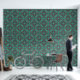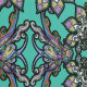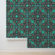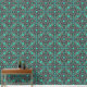 Magnificent design richly decorated with bright floral ornament in Italian Renaissance style. The design is made of flowers drawn in watercolor and black ink, the main background of the wallpaper is light green emerald, and the floral ornament is dominated by emerald green, sky blue and pastel purple colors.