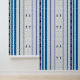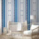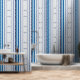 Diseño en color blanco con líneas verticales en tonos azules y brocado abstracto.