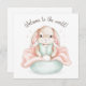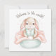Discover this charming illustrated baby bunny, nestled in a cozy blanket with a heartfelt 'Welcome to the World!' message. Surrounded by soft hearts or stars, this design features a gentle pastel color palette of blue, mint, and peach—perfect for newborn gifts or baby shower