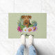 可愛いAiredale Terrierのオリジナル漫画イラストレーションのカラフルの夏の野生の花に囲まれた犬の頭をクローズアップ。赤面のピンクの花、紫色の花、濃いピンクの花、白いデイジーの花と一緒にいくつかの緑の葉花や枝がある。背景色は緑で光水玉模様模様。背景色は他の色に変更でき、水玉模様パターンも好きなように除去でもしきる。名前またはその他の文字文字には、パーソナル化可能なカスタム領域もある。