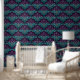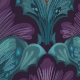 This Art Deco pattern features dramatic, layered fan shapes in deep purples and rich teals, creating a bold and expressive vintage-inspired design. Intricate linework, stylized feather-like forms, and ornamental jewel-toned accents give it a lavish, theatrical feel reminiscent of classic 1920s glamour. The repeating motif feels lush and dimensional.