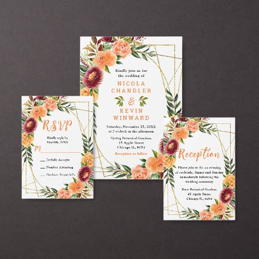 This fun and whimsical wedding invitation features watercolor burgundy red and orange flowers with foliage on a gold geometric frame. The text combines handwritten script and serif fonts for a stylish and modern look. This is perfect for an autumn fall rustic wedding.