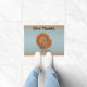This outdoor welcome door mat is light blue with orange top and bottom borders and and an Autumn coloured male turkey with fanned tail standing in Fall leaves. Customise your text with the template.