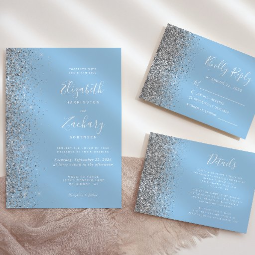 The left-hand edge of this elegant modern wedding invitation features a silver faux glitter design. The customizable text combines white handwriting, copperplate and italic fonts on a pastel baby blue background. Add your favorite photo to the reverse side, along with additional text and a QR code to send guests to your wedding website.
