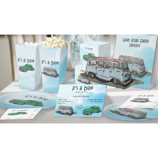 Celebrate the upcoming arrival of your little man with this charming baby shower balloon design. Featuring delightful watercolor illustrations of a playful antique sedan art, it's perfect for a special day. The soft, artistic touch of the watercolor adds a sweet and whimsical feel, while the vehicle theme is ideal for parents who love all things that go. This balloon offers a unique and adorable way to decorate the room to shower the parents-to-be with joy and gifts for their precious baby boy.