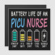 Humorous shift chart showing the battery life of a PICU nurse, also known as a pediatric intensive care nurse, with colorful levels from start to double shift. Ideal for pediatric ICU staff who enjoy relatable workplace humor.