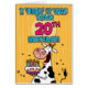 "私は「集めます」それをでしたあなたの第20誕生日!" お誕生日ケーキの挨拶状を握っているおもしろいのb日牛。
