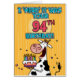 "私は「集めます」それをでしたあなたの第94誕生日!" お誕生日ケーキの挨拶状を握っているおもしろいのb日牛。