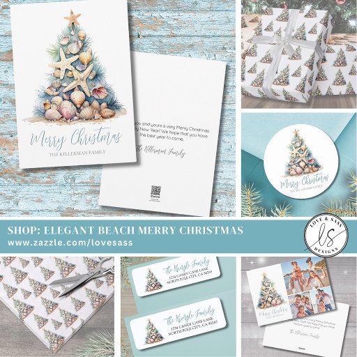 Get into the holiday spirit with this festive kitchen towel featuring a repeating Christmas tree pattern made of shells and starfish. Perfect for anyone who lives in tropical places like Florida, Hawaii, or the Bahamas—or for anyone who simply loves a beachy vibe. The tree design, topped with a starfish, blends soft blue and green hues reminiscent of underwater coral, all set against a sandy base for a rustic watercolor look.