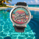 Round wall clock featuring a vibrant beach-themed design with a tropical sunset, palm trees, and colorful beach elements. Perfect for coastal decor, summer vibes, and relaxed interiors.