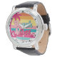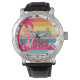 This round wall clock embodies a relaxed, tropical theme with a vibrant, striped sunset background in shades of orange, yellow, pink, and blue. Silhouetted palm trees, a beach umbrella, and a lounge chair complete the serene island scene. The words "Beach Vibes" are prominently displayed in a playful font, making this clock a perfect addition for beach lovers or anyone seeking a summery ambiance.