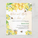 白スタイリッシュと金色の水色の背景。でこぼこ飾したビーと、ハチミツを溶かし、黄色い花模様と花とハチミツびんの入ったハニカム。文字で"何がベビービー"パーソナライズし、beeするママの名前を追加。ゴールデン、ブラック、グリーン文字。1枚= 1枚の招待状を印刷したエッジからエッジ