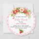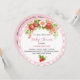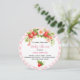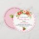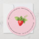 This charming baby shower invitation features a sweet berry-inspired design centered on a soft pink gingham background. A circular layout frames the design, with a delicate watercolor arch of ripe strawberries, blush pink blossoms, and dainty berries cascading across the top. The typography blends playful script with clean, modern fonts, creating an elegant yet whimsical feel. A coordinating strawberry accent at the bottom adds balance, while the overall palette of soft pinks, fresh greens, and vibrant reds gives the invitation a light, cheerful, and garden-fresh aesthetic.