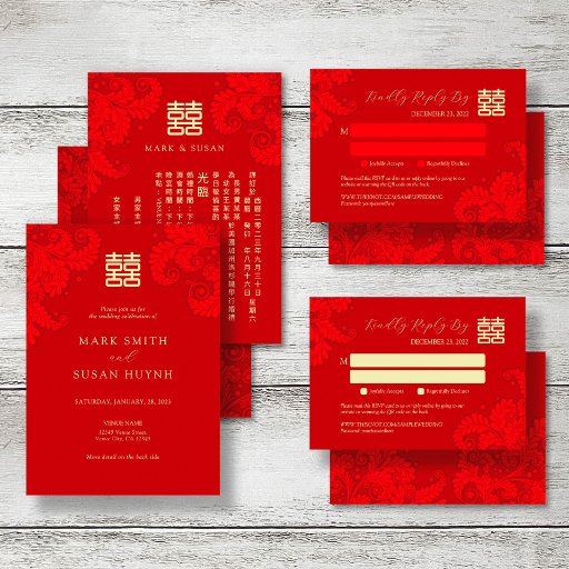 Bilingual Vietnamese English Red Floral Wedding 招待状