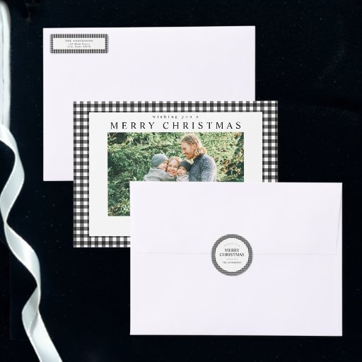 Create your own custom Christmas stickers featuring minimalist typography on a cute classic black and white gingham plaid pattern background.