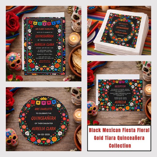 Black Mexican Fiesta Floral Gold Tiara Quinceañera 横断幕