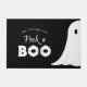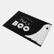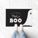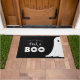 A cute ghost peeks out from the edge of the doormat. "Peek a BOO" text in fun handwritten and decorative style fonts. Shown in colors of black, white, and orange, but all colors are editable. Personalize the curved text with a family name, etc. © Kimbellished, LLC