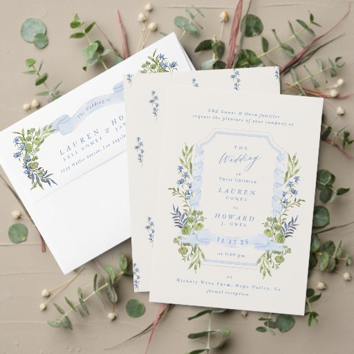 blue and greenery garden crest wreath wedding エンクロージャーカード
