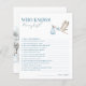 Add fun to your shower with this blue stork winter Who Knows Mommy Best game. Featuring a sweet stork illustration with a snowy winter village, this printable game is a perfect activity for a boy baby shower. Guests can guess mommy’s favorites and learn more about her while creating laughter and memories. A charming addition to your winter stork baby shower theme, this game coordinates beautifully with invitations, thank-you cards, and signs for a cohesive celebration.