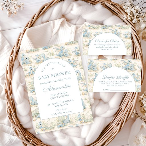 Welcome a little one with this charming storybook-inspired dinosaur design, featuring soft blue illustrations and a delicate vintage nursery feel. The playful dinosaur pattern paired with a clean arched layout creates a gentle and timeless look, perfect for a cozy and joyful baby shower. With its soft color palette and classic storybook aesthetic, this design feels warm, inviting, and effortlessly adorable—ideal for celebrating a baby boy or a whimsical dino-themed event.