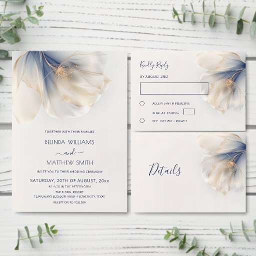 Blue Gold Smoky Watercolor Flower Wedding 招待状