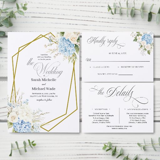 Blue Hydrangea Geometric Wedding Invitation 招待状