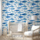 Coastal-inspired wallpaper featuring a blue sardine watercolor pattern in soft ocean tones. Perfect for kitchens, dining areas, or beach-style interiors, this seamless design adds a fresh, Mediterranean feel to your space.
