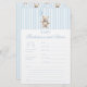 Add a touch of elegance to your teddy bear themed baby boy shower with our sophisticated "Baby predictions and advice" game. Featuring a charming teddy bear wearing a cute blue bow, holding blue balloon, surrounded by blue striped pattern, this delightful activity is perfect for entertaining your guests and creating lasting memories. Ideal for adding fun and excitement to your special celebration!