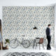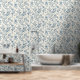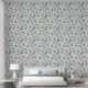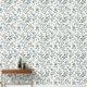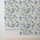 A detailed vintage floral illustration in blue tones, featuring delicately drawn branches, leaves, and blossoms on a light background, creating a classic and elegant botanical look. Toile-de-Jouy