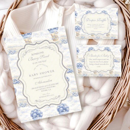 Blueberry Hot Air Balloon Toile Baby Shower 招待状