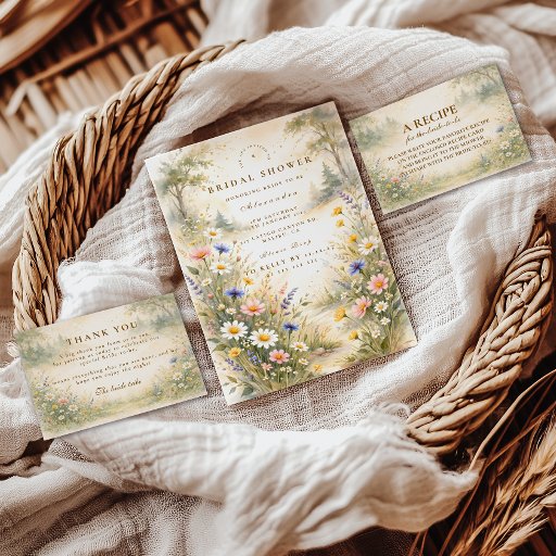 A soft watercolor meadow design featuring delicate daisies, pink cosmos, blue cornflowers, and cheerful yellow blooms gathered in a fresh spring arrangement. The florals rise naturally from the bottom of the layout, creating an airy, open composition with a warm parchment backdrop. Light, romantic, and effortlessly elegant, this design captures the charm of a sunlit countryside garden. Perfect for a bride who loves nature-inspired details with a timeless, graceful touch.