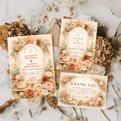 A romantic blush and peach floral design framed by a soft watercolor arch of roses, garden blooms, and airy pampas accents. Warm neutrals and muted sage greenery create an elegant, timeless aesthetic with a subtle western touch from the hat and rope detail. The composition feels refined yet natural — perfect for a boho western celebration, ranch wedding, or romantic garden ceremony. Fully customizable with your names and event details.