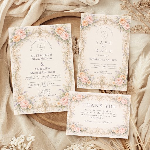 Blush Peach Baroque Rose Wedding 招待状