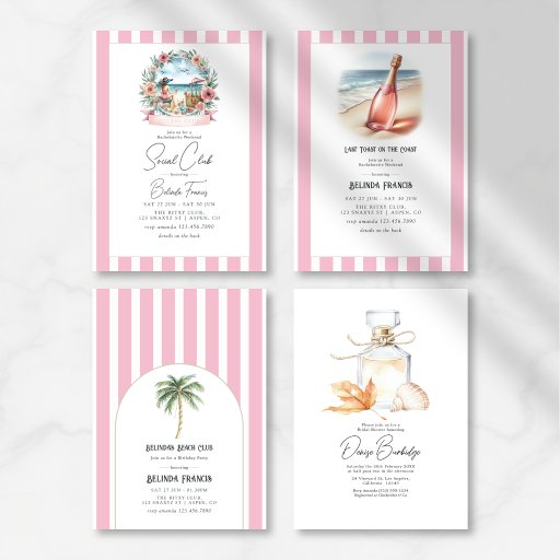 Celebrate in style with this blush pink Beach Club birthday party invitation, featuring elegant vertical stripes and a chic tropical palm tree design. Perfect for coastal birthdays, summer celebrations, and stylish beachside gatherings, this invitation blends modern minimalism with a relaxed luxury aesthetic. Fully customizable with your event details, it’s ideal for creating a coordinated and sophisticated party look across your entire collection.