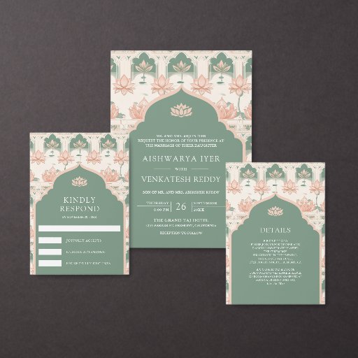 Blush Pink Pastel Green Lotus Pond Indian Wedding 招待状 (この独立クリエイターのコレクションをカスタマイズ。)Blush Pink Pastel Green Lotus Pond Indian Wedding 招待状 (正面)Blush Pink Pastel Green Lotus Pond Indian Wedding 招待状 (内部)