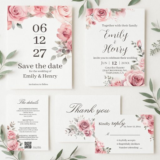 This blush pink floral wedding RSVP card features soft romantic roses and a clean, elegant layout designed to coordinate beautifully with a classic wedding invitation suite.