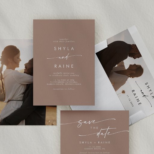 このbohoシックなニュートラルトープ結婚式は、日付の招待はがきを保存し、ミニマルな結婚の完璧な。ベージュの茶色の地球のトーンモダンボヘミアデザインはシンプル、まだクラシックのスタイルを持つ素朴な書をユニーク特徴としている。名前、日付、場所、およびWebサイトのアドレスを結婚使用して、日付はがきを個人用に保結婚存する。