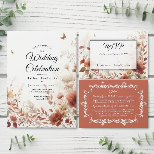 Celebrate your love story with the Boho Browns with Butterflies Floral Wedding Invitation, a design inspired by warm autumn tones and delicate natural beauty. Soft terracotta blooms, muted beige florals, airy dried grasses, and gentle butterfly accents create an organic, flowing composition that feels both romantic and effortlessly refined.