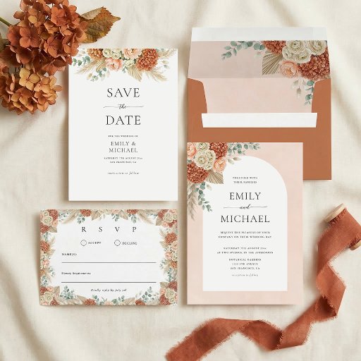 Elevate your boho wedding invitations with this terracotta floral address label. Modern watercolor burnt orange hydrangea, peach peonies, ivory ranunculus flowers, pampas grass and eucalyptus foliage gracefully frame the top corner. They are the perfect finishing touch for a couple mailing out bohemian themed invites for a late spring or summer ceremony.