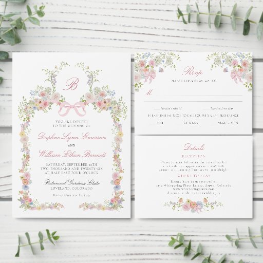 Bows and Wildflowers Return Address Label. These return address labels feature soft watercolor wildflowers accented with a delicate blush pink bow for a romantic, refined look. Inspired by a Victorian English garden, the floral arrangement feels airy and timeless. A beautiful finishing touch that coordinates seamlessly with a classic floral wedding suite.